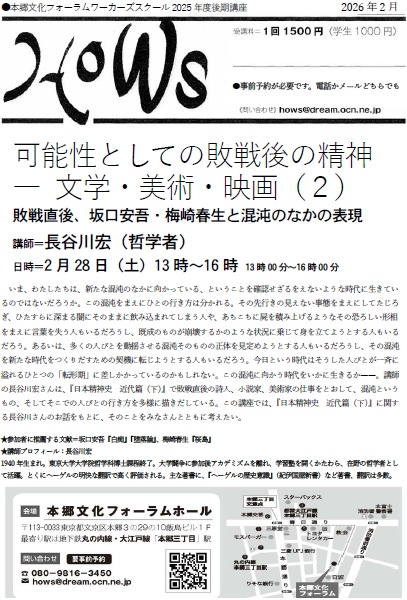 2025年11~2026年3月のHOWS講座・集会(平日PM 6:45~9:00 土曜PM 1:00~4:00)